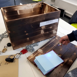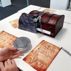 Am Ende des P-Seminars hatten die Schülerinnen und Schüler insgesamt sechs verschiedene Schatztruhen - die nach dem Vorbild von "Timework" sogar teilweise selbst gebaut worden waren - gestaltet und dazu passende mathematische Aufgaben entworfen.