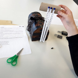 Anregungen erhielten die Schülerinnen und Schüler des P-Seminars durch die Teilnahme an verschiedenen (Online-)Escape-Games. Ein Highlight war der mobile Escape-Room "Timework" des Erlanger Escape-Room-Betreibers "Escape Time". Die beiden Firmengründer und Geschäftsführer Christos Liliaskopoulos und Christos Grammenidis brachten nicht nur fünf verschiedene, selbst entwickelte und in Handarbeit hergestellte Holztruhen voller Rätsel und technischer Raffinessen mit ans GFS, sondern erläuterten ausführlich den Prozess der Entstehung eines professionellen Escape-Spiels und konnten den Seminarteilnehmerinnen und Seminarteilnehmern somit wertvolle Anregungen für die Entwicklung der eigenen EduBreakouts geben.