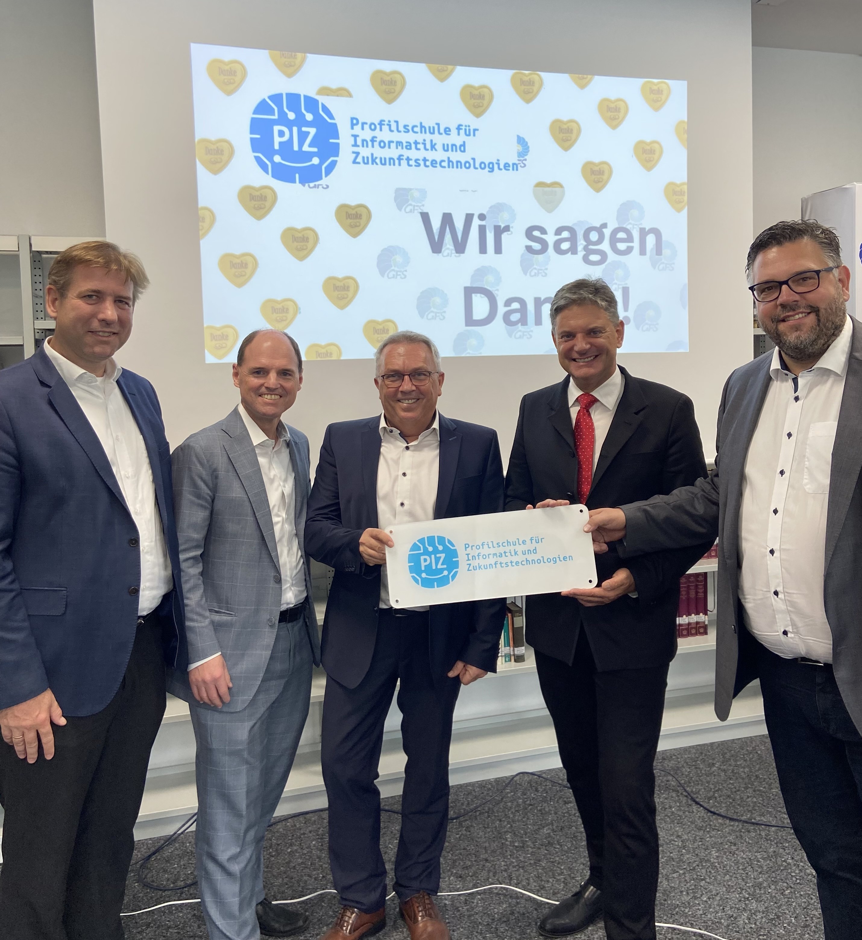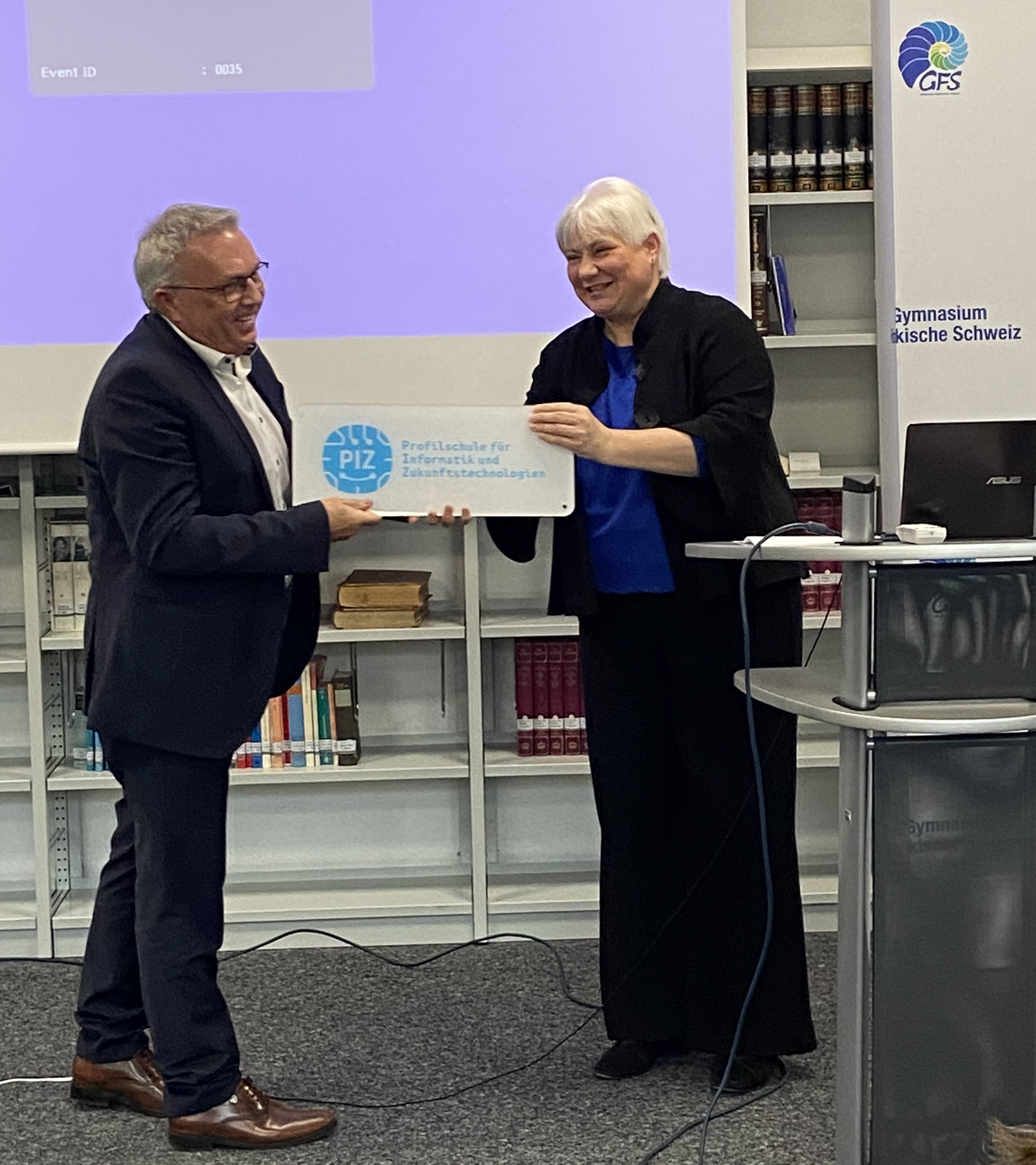 Die StDin Martina Schmidt-Kessel übergab dem sichtlich stolzen Schulleiter, OStD Siegfried Reck, die PIZ- Auszeichnung und würdigte diese als große Teamleistung. Ohne die engagierten Lehrerinnen und Lehrer, motivierten Schülerinnen und Schüler sowie externen Partner und Unterstützer wäre vieles nicht möglich gewesen. Das GFS sei ein herausragendes Beispiel dafür, wie Informatik über den Lehrplan hinaus praxisnah vermittelt und „mit Leben gefüllt wird“.
