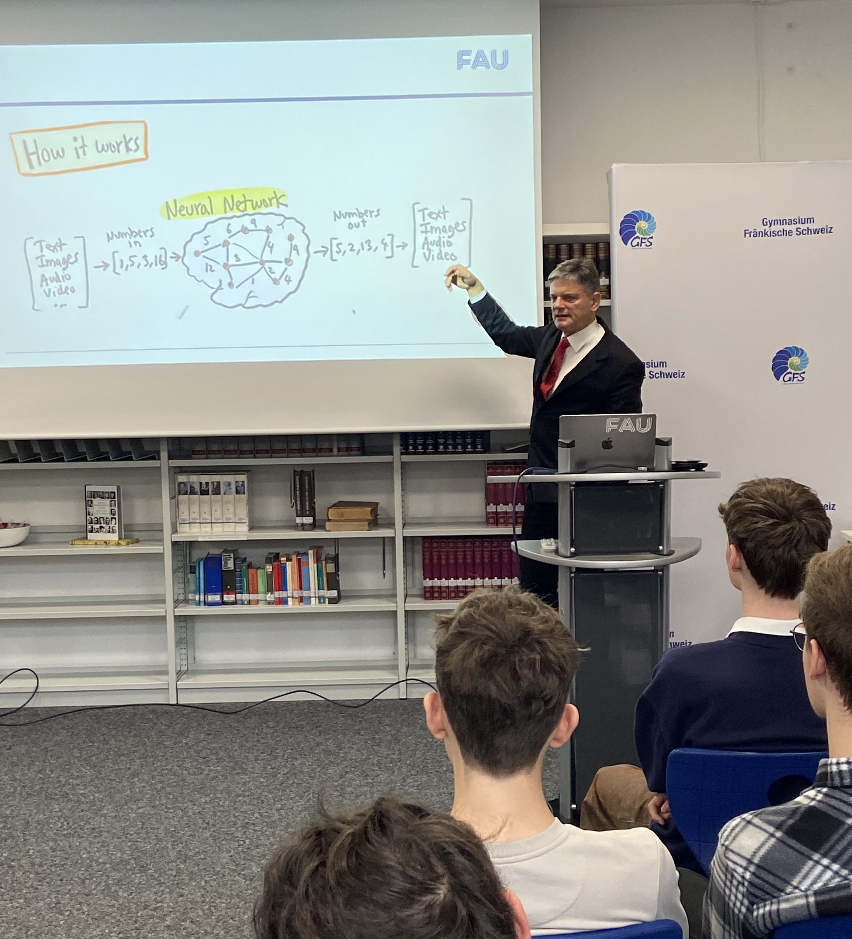 Ein Höhepunkt stellte der Impulsvortrag über Künstliche Intelligenz (KI) von Prof. Dr. Joachim Hornegger dar, der selbst Schüler am GFS war. Er betonte die große Bedeutung, sich frühzeitig mit Informatik und Zukunftstechnologien auseinanderzusetzen – gerade schon in der Schule. Humorvoll demonstrierte er die immense Leistungsfähigkeit von KI anhand eines fiktiven Entschuldigungsbriefes, den er zunächst generieren und dann in verschiedenen Sprachen vorlesen ließ. Dabei machte er anschaulich, wie flexibel und schnell moderne Systeme arbeiten können.