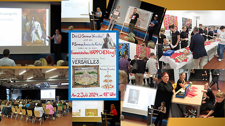Am Dienstag, dem 02. Juli 2024, lud das P-Seminar "Französische Küche" und das W-Seminar "Versailles" zu einem französischen Häppchening ein, um die Gäste kulinarisch und historisch zu verwöhnen. Während das P-Seminar Amuse-Bouches, die sog. Gaumenfreuden, kredenzte, unterhielt das W-Seminar mit Themen rund um Versailles. So wurden Präsentationen zu Ludwig XIV. und seine Propaganda sowie voranschreitend auch zu Marie Antoinette und die Französische Revolution gehalten. Abschießend wurde der Versailler Vertrag unter die Lupe genommen und die Folgen seiner Bestimmungen für Deutschland erläutert. Die architektonischen Meisterwerke wie die Gärten von Versailles, die politischen Ereignisse und die kulturellen Höhepunkte wie den tanzenden Sonnenkönig machten Versailles zu einem der bekanntesten Orte der Welt. Zwischendurch gab es in einem Dreigänge-Menu die französischen Köstlichkeiten. Von leckeren kleinen Vorspeisen über verführerische Hauptgerichte im Miniaturformat bis hin zu süßen Verführungen - jedes Häppchen war eine Reise durch die französische Kulinarik. Da weiß man auch, warum die Kunst des französischen Mahls seit 2010 als immaterielles Kulturerbe der UNESCO anerkannt ist. Die Veranstaltung hat gezeigt, dass Geschichte und gutes Essen eine gelungene Kombination sind und der Abend kurzweilig war.