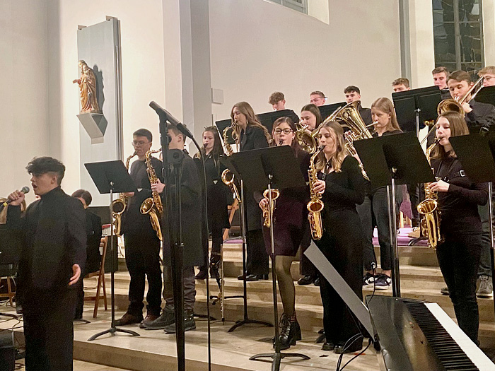 Nach den Auftritten des Orchesters und des Lehrerchors präsentierte das Projektensemble das bekannteste und zugleich beliebteste deutschsprachige Weihnachtslied: Stille Nacht, Heilige Nacht. Mariah Careys Welthit "All I want for Christmas is you" wurde im Anschluss von der Schulband inszeniert. Die talentierten Stimmen des großen Chors erfüllten daraufhin den Kirchenraum - trotz einiger krankheitsbedingter Ausfälle bei den Proben und am Abend selbst - in beeindruckender Harmonie und schufen eine feierliche Atmosphäre. Das Finale des knapp eineinhalbstündigen Konzerts gestaltete schließlich die Big Band, die im Rahmen von drei bekannten Liedern ihr musikalisches Können eindrucksvoll unter Beweis stellte.