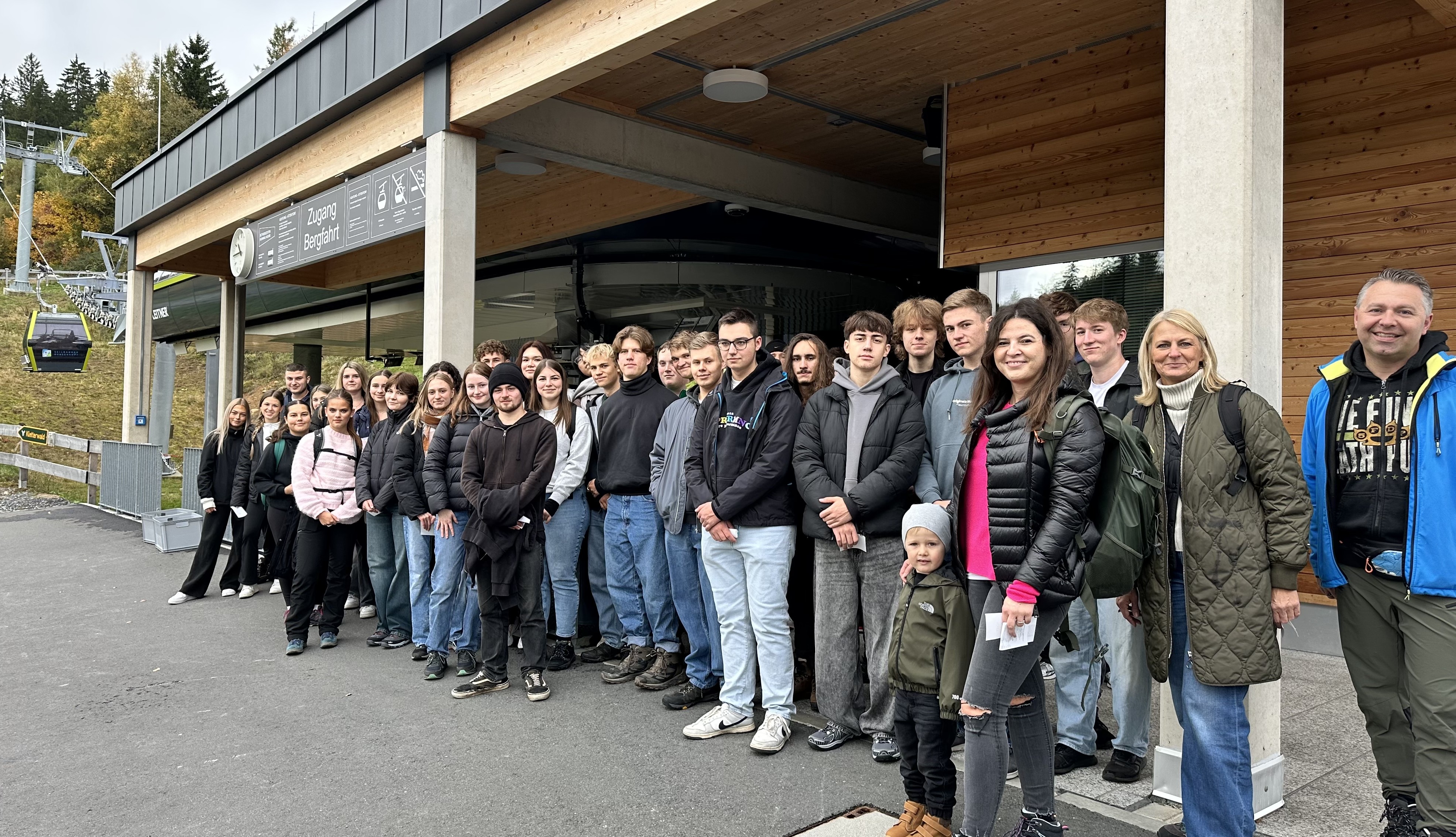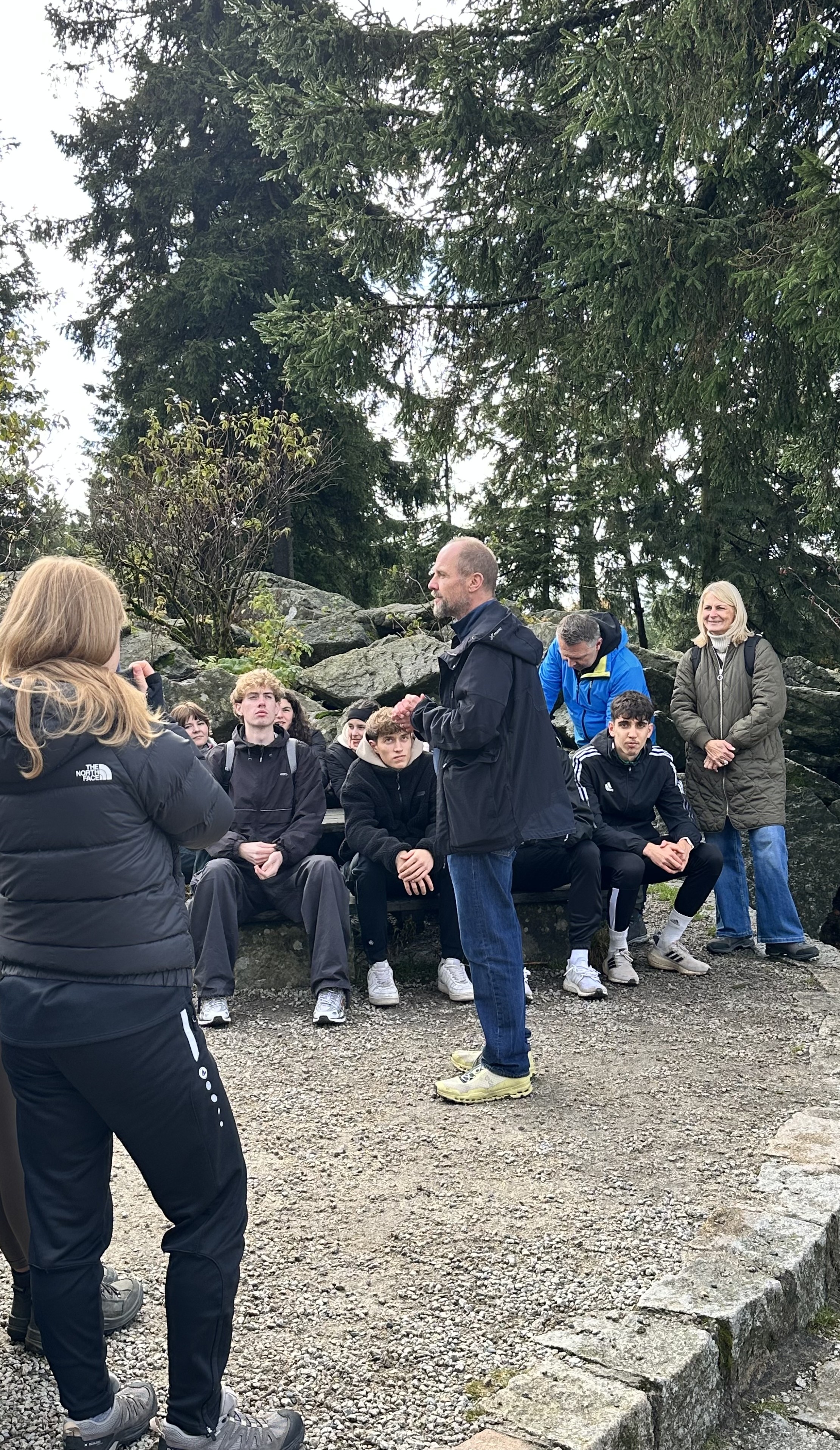 Nach der Ankunft im Sportcamp Nordbayern in Bischofsgrün führte der erste Programmpunkt direkt in die Höhenlagen des Mittelgebirges – nämlich mit der modernen Seilbahn hinauf auf den Ochsenkopf. Wilhelm Zapf, Tourismusexperte der Gemeinde Bischofsgrün, gab den angehenden Abiturientinnen und Abiturienten spannende Einblicke in die touristische Entwicklung des Ochsenkopfes sowie in künftig geplante Projekte wie den Ausbau eines Erlebnisspielplatzes, weiterer Mountainbike-Trails und einer Aussichtsplattform. Kontrastierend zur touristischen Inwertsetzung des Ochsenkopfes verwies er auf den nahegelegenen Schneeberg, mit 1051 m der höchste Berg Frankens, der als geschütztes Naturgebiet weitgehend unerschlossen bleibt und lediglich Forst- und Wanderwege aufweist.